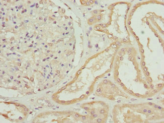 Immunohistochemistry of paraffin-embedded human kidney tissue using CSB-PA026606ESR2HU at dilution of 1:100