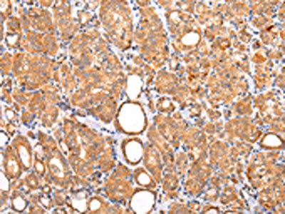 The image on the left is immunohistochemistry of paraffin-embedded Human thyroid cancer tissue using CSB-PA213838(ZNF420 Antibody) at dilution 1/20, on the right is treated with synthetic peptide. (Original magnification: ×200)