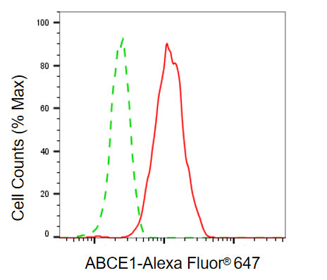 Flow cytometric analysis of ABCE1 expression in C2C12 cells using ABCE1 antibody. Green, isotype control; red, ABCE1.