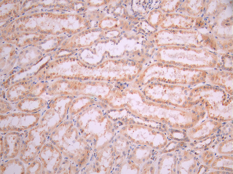 IHC image of CSB-RA146479A0HU diluted at 1:100 and staining in paraffin-embedded human kidney tissue performed on a Leica BondTM system. After dewaxing and hydration, antigen retrieval was mediated by high pressure in a citrate buffer (pH 6.0). Section was blocked with 10% normal goat serum 30min at RT. Then primary antibody (1% BSA) was incubated at 4°C overnight. The primary is detected by a Goat anti-rabbit polymer IgG labeled by HRP and visualized using 0.05% DAB.