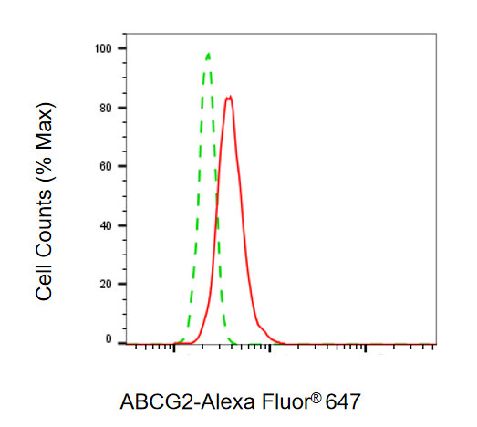 Flow cytometric analysis of ABCG2 expression in HT-1080 cells using ABCG2 antibody. Green, isotype control; red, ABCG2.