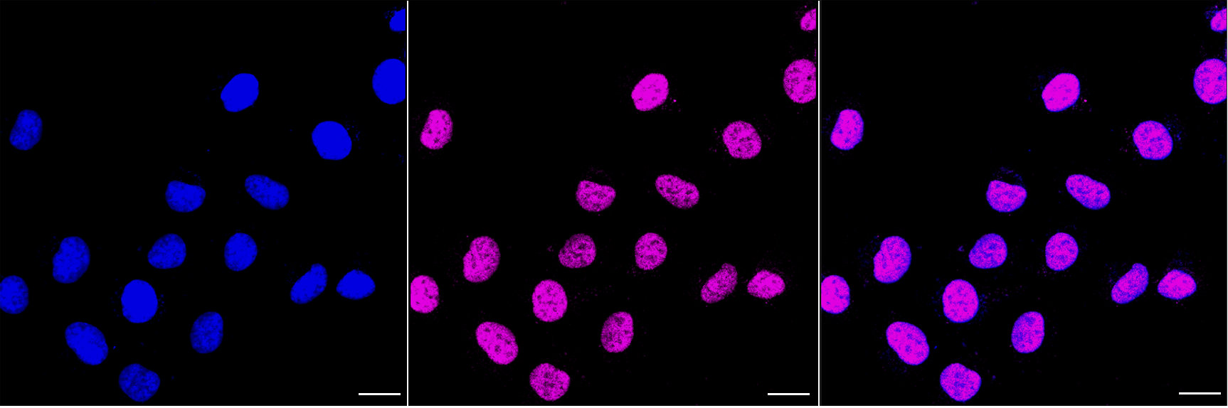 Immunocytochemical staining of HT-1080 cells with ABCG2 antibody. Nuclei were stained blue with DAPI; ABCG2 was stained magenta with Alexa Fluor? 647. Images were taken using Leica stellaris 5. Protein abundance based on laser Intensity and smart gain: Medium. Scale bar, 20 μm.