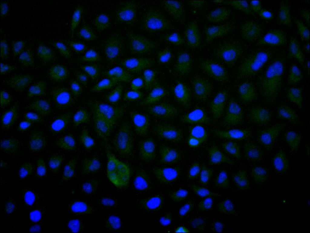 Immunofluorescence staining of Hela cell with CSB-RA858020A0HU at 1:50, counter-stained with DAPI. The cells were fixed in 4% formaldehyde, permeabilized using 0.2% Triton X-100 and blocked in 10% normal Goat Serum. The cells were then incubated with the antibody overnight at 4°C. The secondary antibody was Alexa Fluor 488-congugated AffiniPure Goat Anti-Rabbit IgG(H+L).