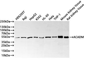 Positive WB detected in: HEK293T whole cell lysate(30μg), Raji whole cell lysate(30μg), HepG2 whole cell lysate(30μg), K562 whole cell lysate(30μg), HL-60 whole cell lysate(30μg), Hela whole cell lysate(30μg), THP-1 whole cell lysate(30μg), Mouse kidney tissue lysate(30μg), Rat kidney tissue lysate(30μg)