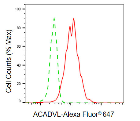 Flow cytometric analysis of ACADVL expression in HepG2 cells using ACADVL antibody. Green, isotype control; red, ACADVL.