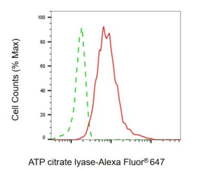 Flow cytometric analysis of ATP citrate lyase expression in HepG2 cells using ATP citrate lyase antibody. Green, isotype control; red, ATP citrate lyase.