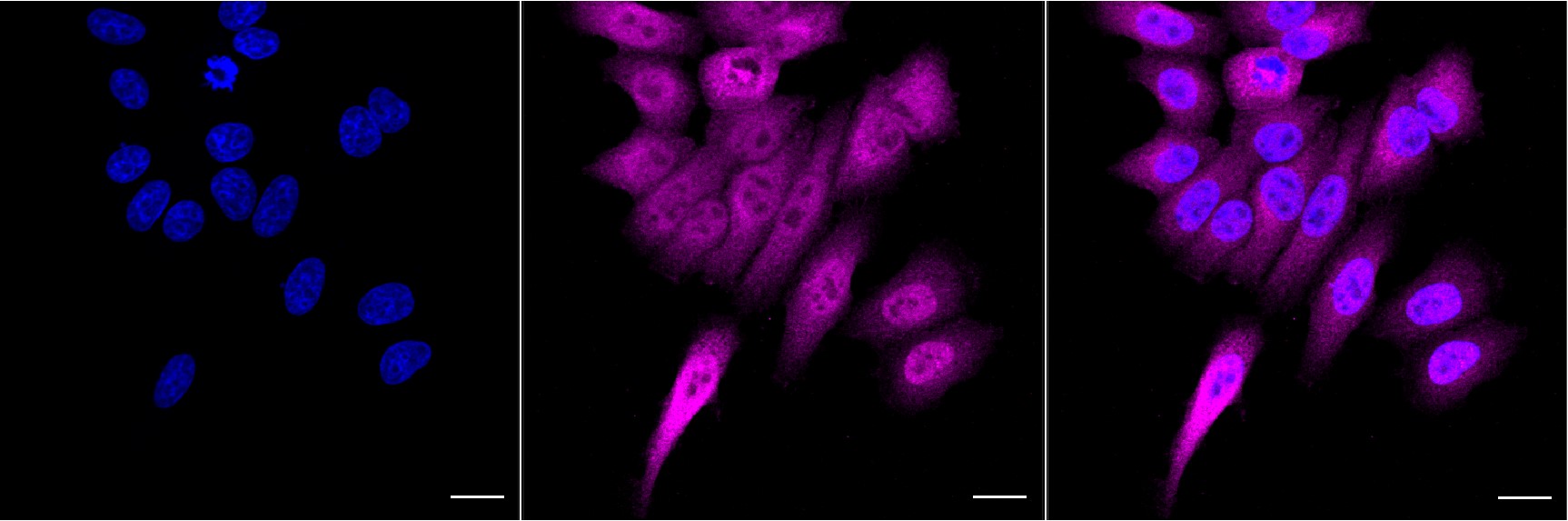 Immunocytochemical staining of HepG2 cells with ATP citrate lyase antibody. Nuclei were stained blue with DAPI; ATP citrate lyase was stained magenta with Alexa Fluor? 647. Images were taken using Leica stellaris 5. Protein abundance based on laser Intensity and smart gain: High. Scale bar, 20 μm.