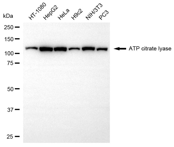 Western blotting analysis using ATP citrate lyase antibody. Total cell lysates (30 μg) from various cell lines were loaded and separated by SDS-PAGE. The blot was incubated with ATP citrate lyase antibody and HRP-conjugated goat anti-rabbit secondary antibody respectively.