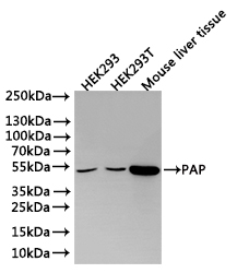 Positive WB detected in: HEK293 whole cell lysate(30μg), HEK293T whole cell lysate(30μg), Mouse liver tissue lysate(30μg)