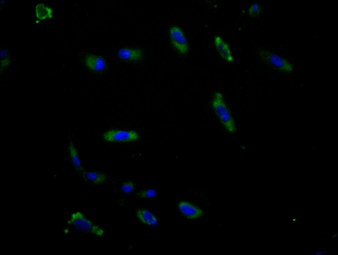 Immunofluorescence staining of A-549 cell with CSB-RA583012A0HU at 1:50, counter-stained with DAPI. The cells were fixed in 4% formaldehyde and blocked in 10% normal Goat Serum. The cells were then incubated with the antibody overnight at 4°C. The secondary antibody was Alexa Fluor 488-congugated AffiniPure Goat Anti-Rabbit IgG(H+L).