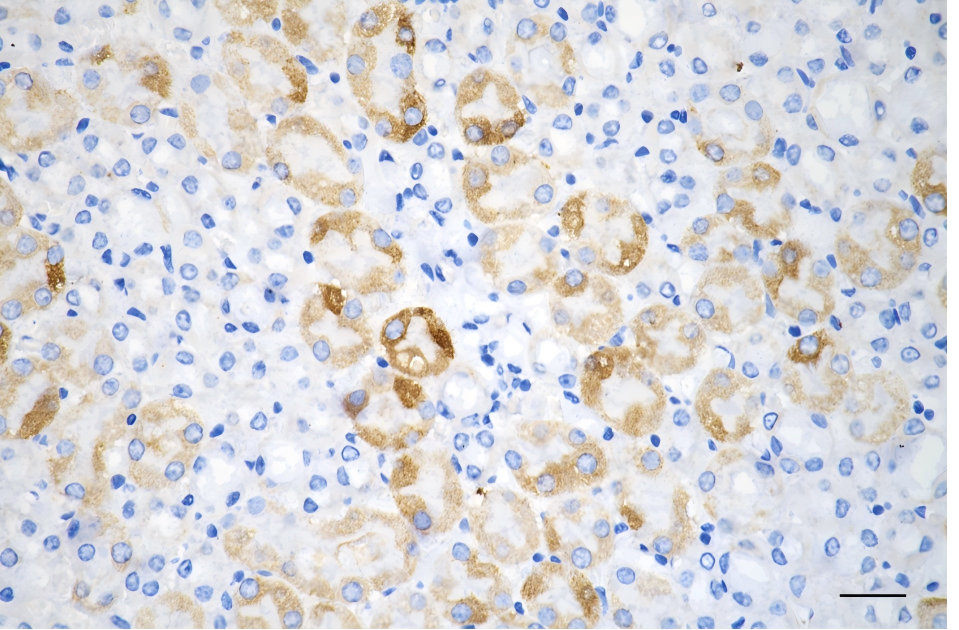 Immunohistochemistry was performed on paraffin-embedded mouse kidney using ACSL4 antibody. Antigen retrieval was done in sodium citrate buffer (pH 6.0). DAB was used for detection, with hematoxylin counterstaining. Images were acquired using a Nikon Ci-L Plus microscope (40× objective). Scale bar: 25 μm.