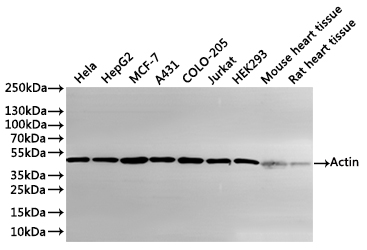 Positive WB detected in: Hela whole cell lysate(30μg), HepG2 whole cell lysate(30μg), MCF-7 whole cell lysate(30μg), A431 whole cell lysate(30μg), COLO-205 whole cell lysate(30μg), Jurkat whole cell lysate(30μg), HEK293 whole cell lysate(30μg), Mouse heart tissue lysate(30μg), Rat heart tissue lysate(30μg)