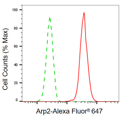 Flow cytometric analysis of Arp2 expression in C2C12 cells using Arp2 antibody. Green, isotype control; red, Arp2.