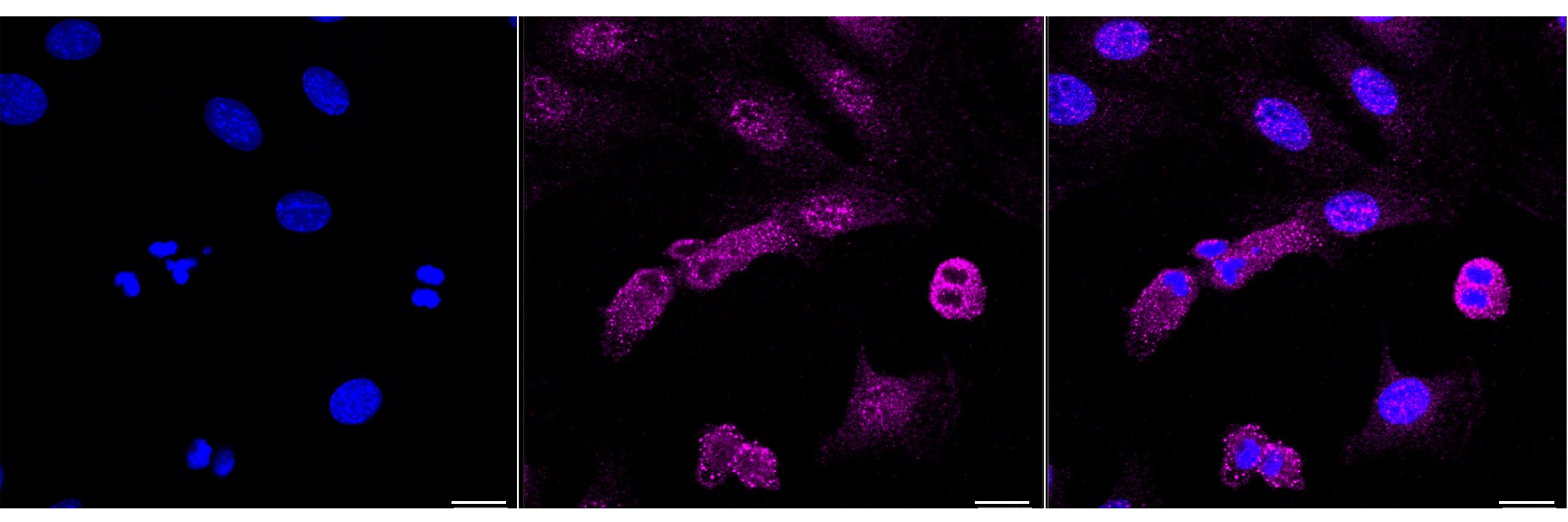 Immunocytochemical staining of C2C12 cells with Arp2 antibody. Nuclei were stained blue with DAPI; Arp2 was stained magenta with Alexa Fluor? 647. Images were taken using Leica stellaris 5. Protein abundance based on laser Intensity and smart gain: Medium. Scale bar, 20 μm.