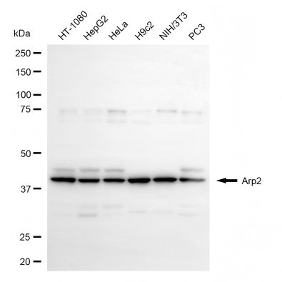 Western blotting analysis using Arp2 antibody. Total cell lysates (30 μg) from various cell lines were loaded and separated by SDS-PAGE. The blot was incubated with Arp2 antibody and HRP-conjugated goat anti-rabbit secondary antibody respectively.