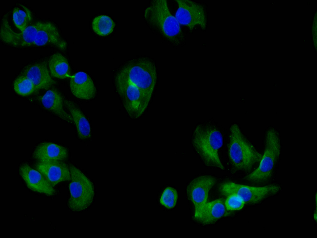 Immunofluorescence staining of A549 cell with CSB-RA053883A0HU at 1:50 , counter-stained with DAPI. The cells were fixed in 4% formaldehyde and blocked in 10% normal Goat Serum. The cells were then incubated with the antibody overnight at 4°C. The secondary antibody was Fluorescein Alexa Fluor 488-congugated AffiniPure Goat Anti-Rabbit IgG(H+L).