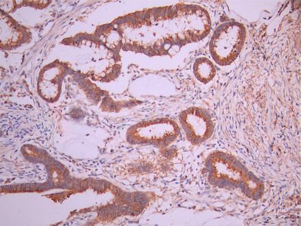 IHC image of CSB-RA053883A0HU diluted at 1:100 and staining in paraffin-embedded human gastric cancer performed on a Leica BondTM system. After dewaxing and hydration, antigen retrieval was mediated by high pressure in a citrate buffer (pH 6.0). Section was blocked with 10% normal goat serum 30min at RT. Then primary antibody (1% BSA) was incubated at 4°C overnight. The primary is detected by a Goat anti-rabbit polymer IgG labeled by HRP and visualized using 0.05% DAB.