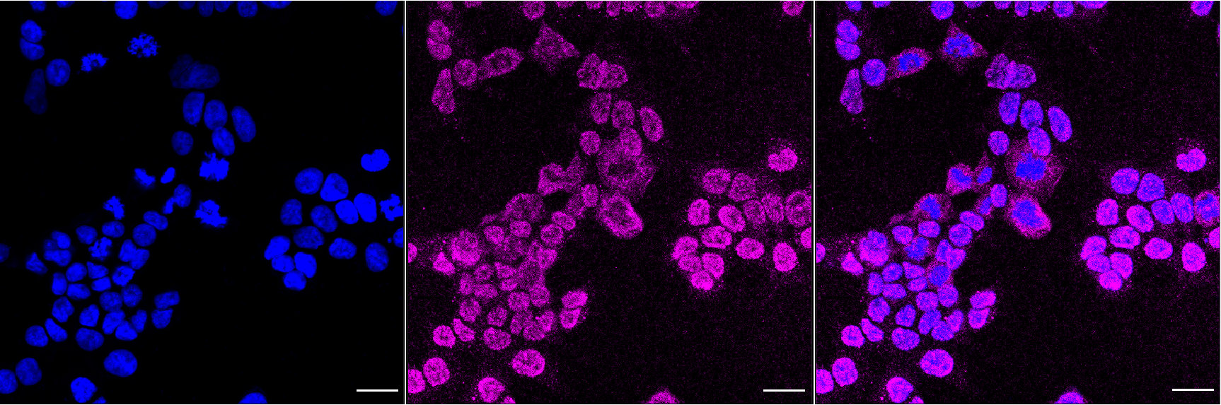 Immunocytochemical staining of HAP-1 cells with ADK antibody. Nuclei were stained blue with DAPI; ADK was stained magenta with Alexa Fluor? 647. Images were taken using Leica stellaris 5. Protein abundance based on laser Intensity and smart gain: Medium. Scale bar, 20 μm.