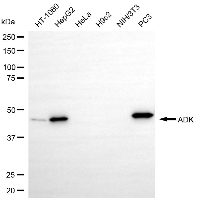 Western blotting analysis using ADK antibody. Total cell lysates (30 μg) from various cell lines were loaded and separated by SDS-PAGE. The blot was incubated with ADK antibody and HRP-conjugated goat anti-rabbit secondary antibody respectively.