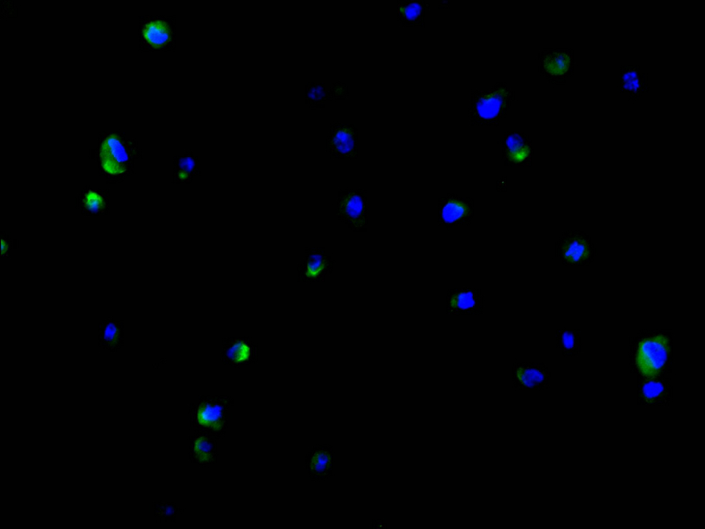 Immunofluorescence staining of THP-1 cell with CSB-RA791733A0HU at 1:50, counter-stained with DAPI. The cells were fixed in 4% formaldehyde and blocked in 10% normal Goat Serum. The cells were then incubated with the antibody overnight at 4°C. The secondary antibody was Alexa Fluor 488-congugated AffiniPure Goat Anti-Rabbit IgG(H+L).