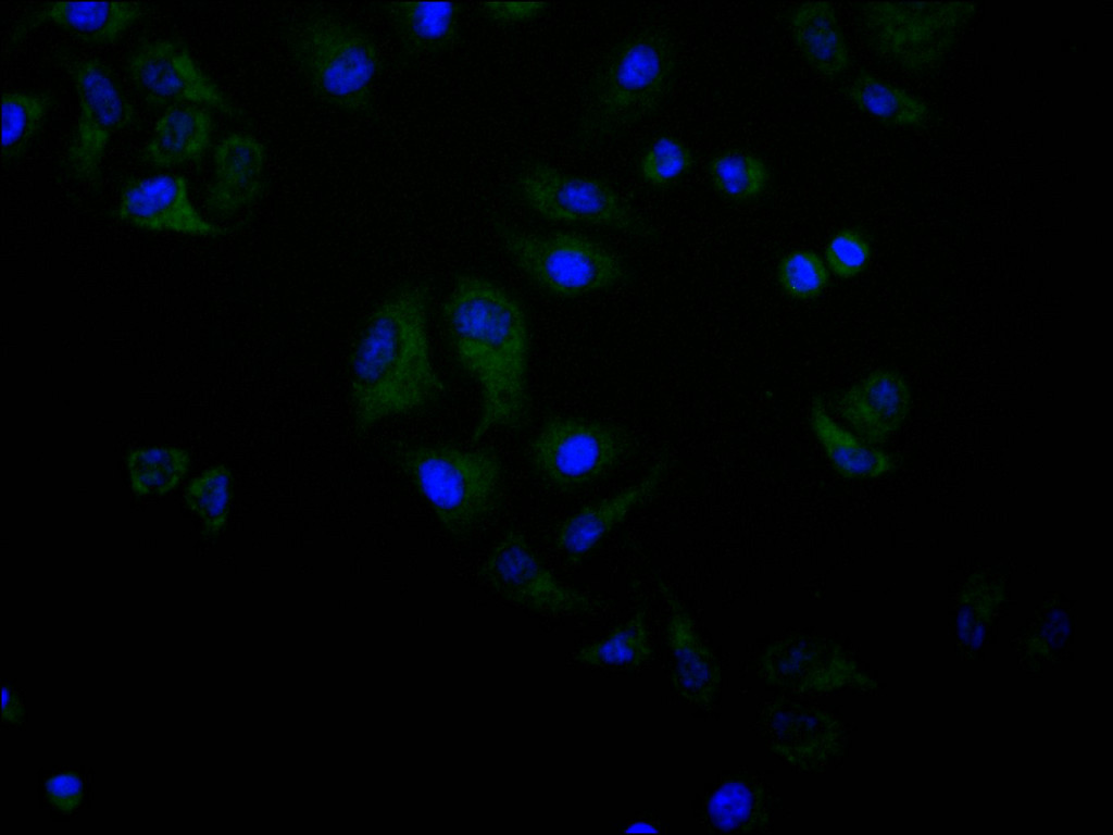 Immunofluorescence staining of Hela cell with CSB-RA597662A0HU at 1:50, counter-stained with DAPI. The cells were fixed in 4% formaldehyde, permeabilized using 0.2% Triton X-100 and blocked in 10% normal Goat Serum. The cells were then incubated with the antibody overnight at 4°C. The secondary antibody was Alexa Fluor 488-congugated AffiniPure Goat Anti-Rabbit IgG(H+L).