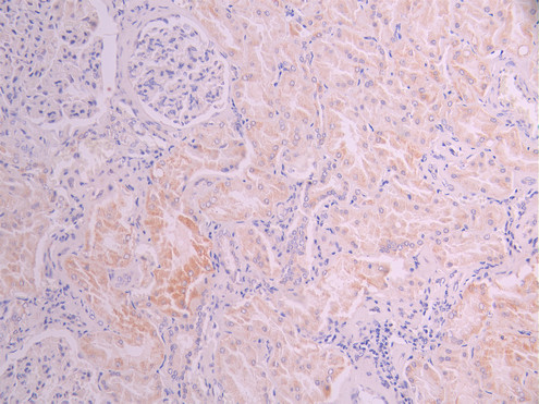 IHC image of CSB-RA597662A0HU diluted at 1:100 and staining in paraffin-embedded human kidney tissue performed on a Leica BondTM system. After dewaxing and hydration, antigen retrieval was mediated by high pressure in a citrate buffer (pH 6.0). Section was blocked with 10% normal goat serum 30min at RT. Then primary antibody (1% BSA) was incubated at 4°C overnight. The primary is detected by a Goat anti-rabbit polymer IgG labeled by HRP and visualized using 0.05% DAB.