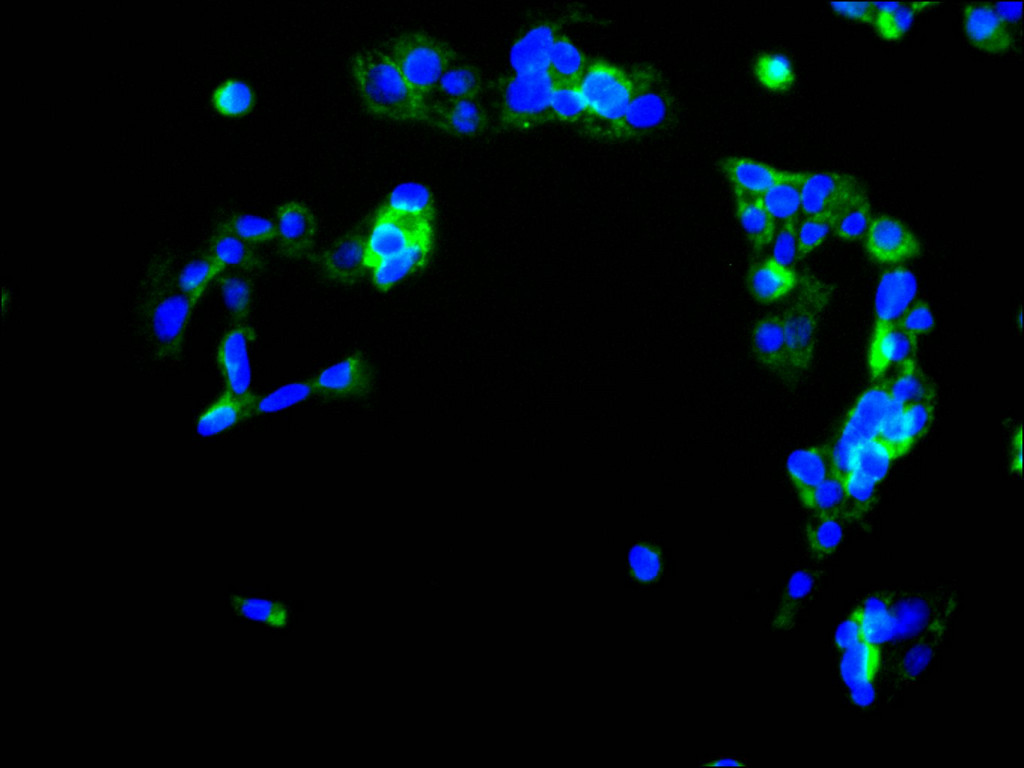 Immunofluorescence staining of HepG2 cell with CSB-RA981900A0HU at 1:50 , counter-stained with DAPI. The cells were fixed in 4% formaldehyde, permeabilized using 0.2% Triton X-100 and blocked in 10% normal Goat Serum. The cells were then incubated with the antibody overnight at 4°C. The secondary antibody was Alexa Fluor 488-congugated AffiniPure Goat Anti-Rabbit IgG(H+L).