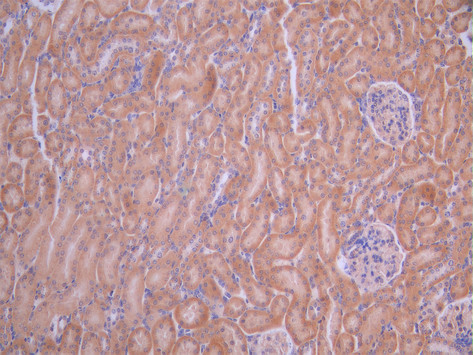 IHC image of CSB-RA981900A0HU diluted at 1:100 and staining in paraffin-embedded mouse kidney tissue performed on a Leica BondTM system. After dewaxing and hydration, antigen retrieval was mediated by high pressure in a citrate buffer (pH 6.0). Section was blocked with 10% normal goat serum 30min at RT. Then primary antibody (1% BSA) was incubated at 4°C overnight. The primary is detected by a Goat anti-rabbit polymer IgG labeled by HRP and visualized using 0.05% DAB.