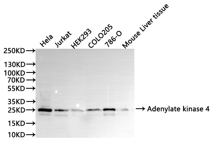 Positive WB detected in: Hela whole cell lysate(30μg), Jurkat whole cell lysate(30μg), HEK293 whole cell lysate(30μg), COLO205 whole cell lysate(30μg), 786-O whole cell lysate(30μg), Mouse liver tissue lysate(30μg)