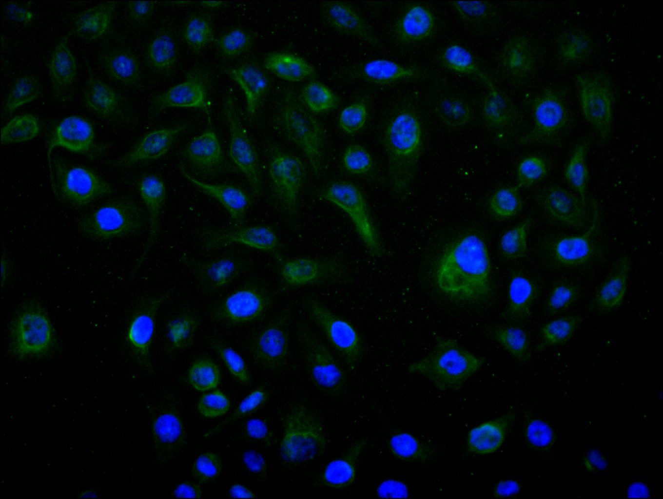 Immunofluorescence staining of A549 cell with CSB-RA001553MA1HU at 1:30 ,counter-stained with DAPI. The cells were fixed in 4% formaldehyde, permeabilized using 0.2% Triton X-100 and blocked in 10% normal Goat Serum. The cells were then incubated with the antibody overnight at 4°C. The secondary antibody was Fluorescein (FITC) AffiniPure Goat Anti-Human IgG, Fcγ fragment specific.