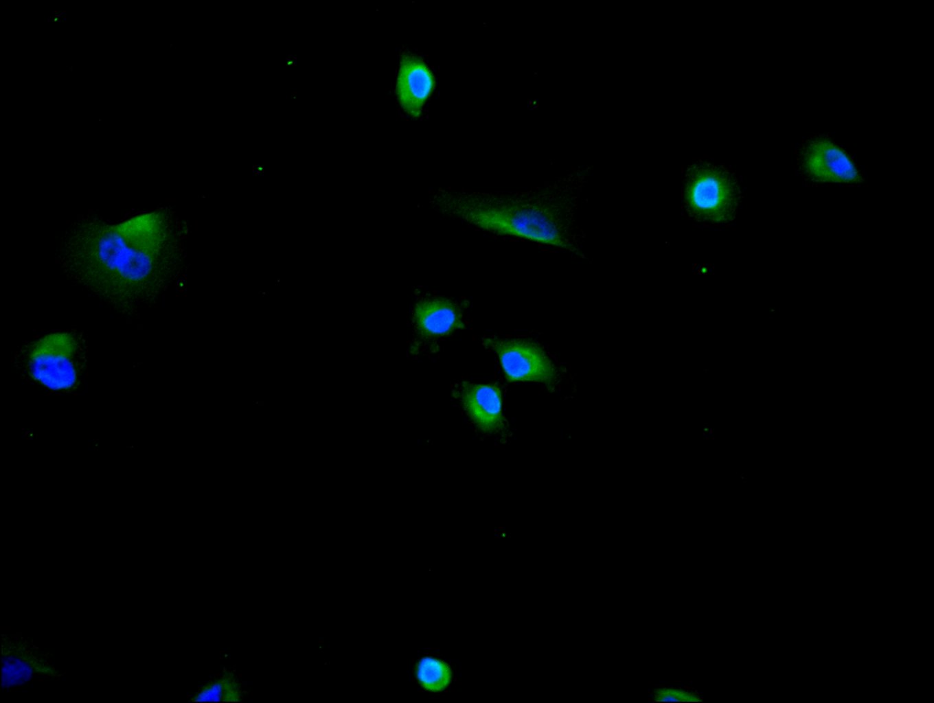 Immunofluorescence staining of Hela cell with CSB-RA001553MA1HU at 1:30 ,counter-stained with DAPI. The cells were fixed in 4% formaldehyde, permeabilized using 0.2% Triton X-100 and blocked in 10% normal Goat Serum. The cells were then incubated with the antibody overnight at 4°C. The secondary antibody was Fluorescein (FITC) AffiniPure Goat Anti-Human IgG, Fcγ fragment specific.
