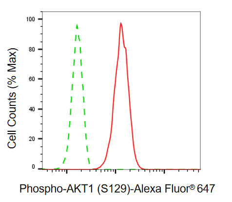 Flow cytometric analysis of phospho-AKT1 (S129) expression in C2C12 cells using phospho-AKT1 (S129) antibody. Green, isotype control; red, phospho-AKT1 (S129).