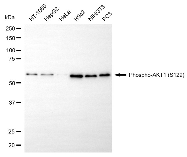 Western blotting analysis using phospho-AKT1 (S129) antibody. Total cell lysates (30 μg) from various cell lines were loaded and separated by SDS-PAGE. The blot was incubated with phospho-AKT1 (S129) antibody and HRP-conjugated goat anti-rabbit secondary antibody respectively.