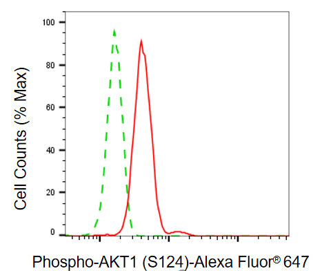 Flow cytometric analysis of phospho-AKT1 (S124) expression in C2C12 cells using phospho-AKT1 (S124) antibody. Green, isotype control; red, phospho-AKT1 (S124).