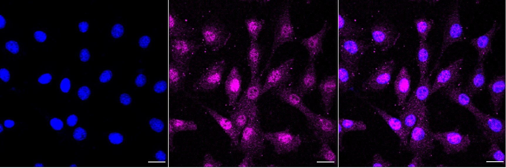 Immunocytochemical staining of C2C12 cells with Phospho-AKT1 (S124) antibody. Nuclei were stained blue with DAPI; Phospho-AKT1 (S124) was stained magenta with Alexa Fluor? 647. Images were taken using Leica stellaris 5. Protein abundance based on laser Intensity and smart gain: Medium. Scale bar, 20 μm.