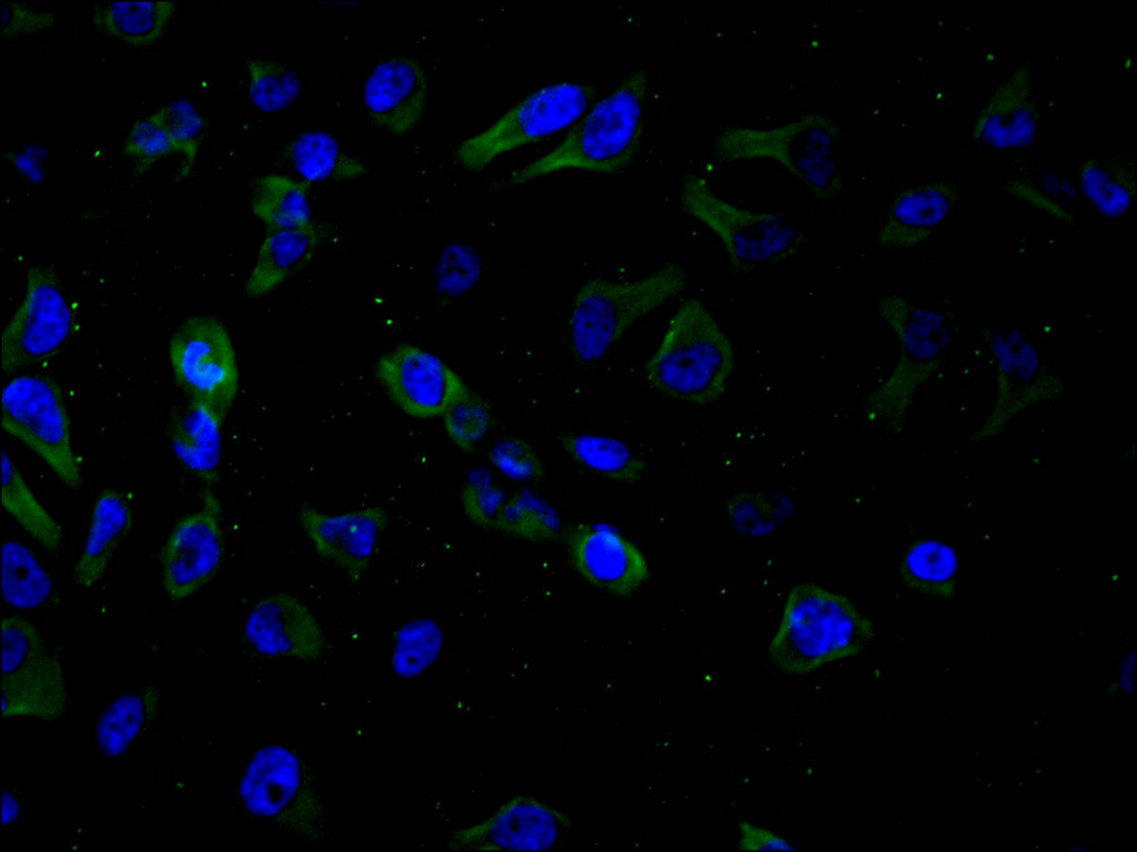 Immunofluorescence staining of MCF-7 cell with CSB-RA166610A0HU at 1:50, counter-stained with DAPI. The cells were fixed in 4% formaldehyde and blocked in 10% normal Goat Serum. The cells were then incubated with the antibody overnight at 4°C. The secondary antibody was Alexa Fluor 488-congugated AffiniPure Goat Anti-Rabbit IgG(H+L).
