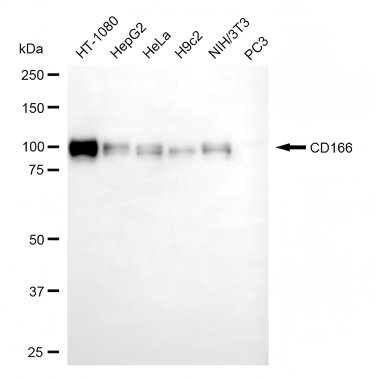 Western blotting analysis using CD166 antibody. Total cell lysates (30 μg) from various cell lines were loaded and separated by SDS-PAGE. The blot was incubated with CD166 antibody and HRP-conjugated goat anti-rabbit secondary antibody respectively.