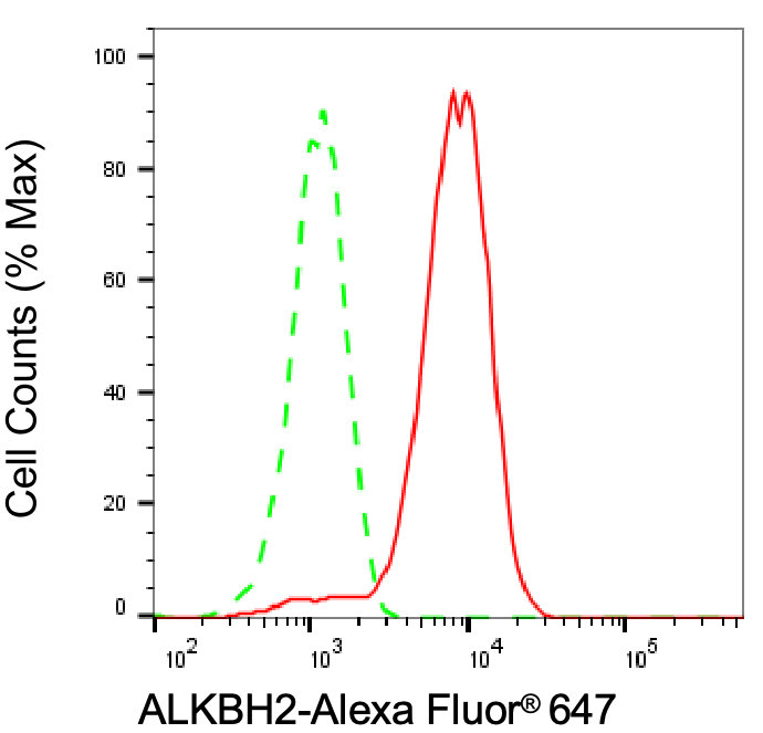 Flow cytometric analysis of ALKBH2 expression in HepG2 cells using ALKBH2 antibody. Green, isotype control; red, ALKBH2.