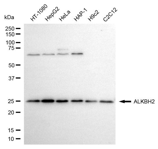 Western blotting analysis using ALKBH2 antibody. Total cell lysates (30 μg) from various cell lines were loaded and separated by SDS-PAGE. The blot was incubated with ALKBH2 antibody and HRP-conjugated goat anti-rabbit secondary antibody respectively.