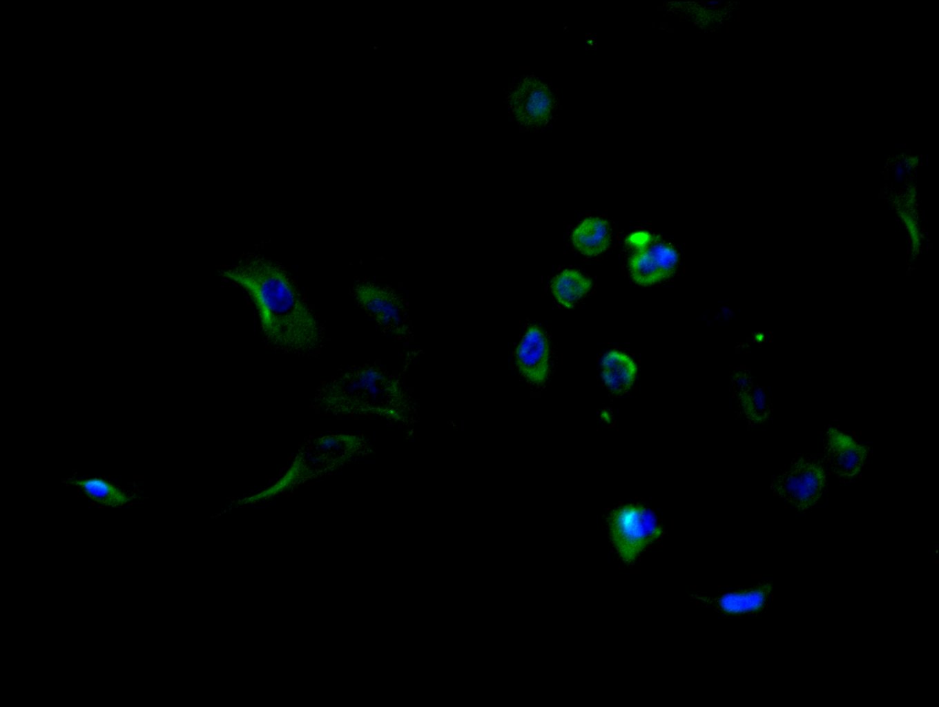 Immunofluorescence staining of HepG2 cell with CSB-RA998339A0HU at 1:50, counter-stained with DAPI. The cells were fixed in 4% formaldehyde and blocked in 10% normal Goat Serum. The cells were then incubated with the antibody overnight at 4°C. The secondary antibody was Alexa Fluor 488-congugated AffiniPure Goat Anti-Rabbit IgG(H+L).