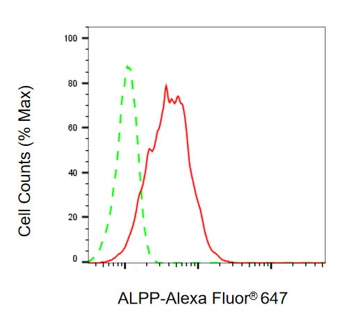 Flow cytometric analysis of ALPP expression in HepG2 cells using ALPP antibody. Green, isotype control; red, ALPP.