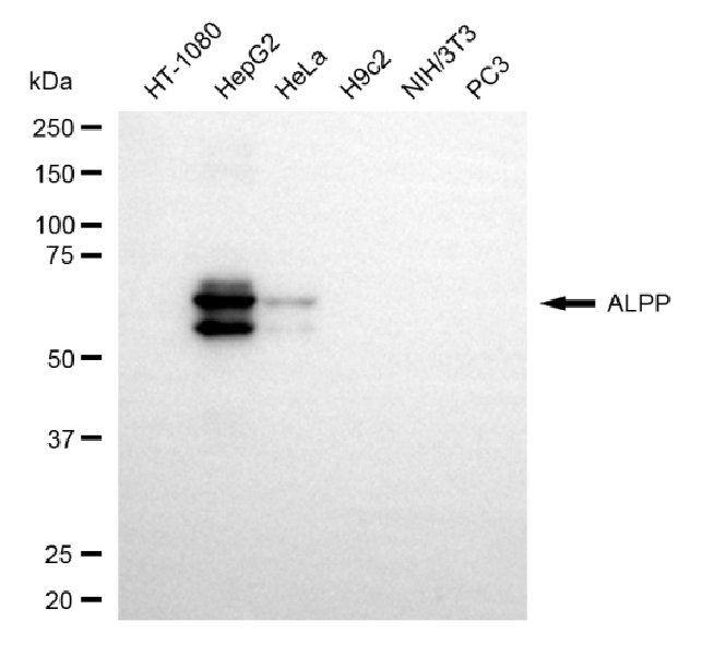 Western blotting analysis using ALPP antibody. Total cell lysates (30 μg) from various cell lines were loaded and separated by SDS-PAGE. The blot was incubated with ALPP antibody and HRP-conjugated goat anti-rabbit secondary antibody respectively.