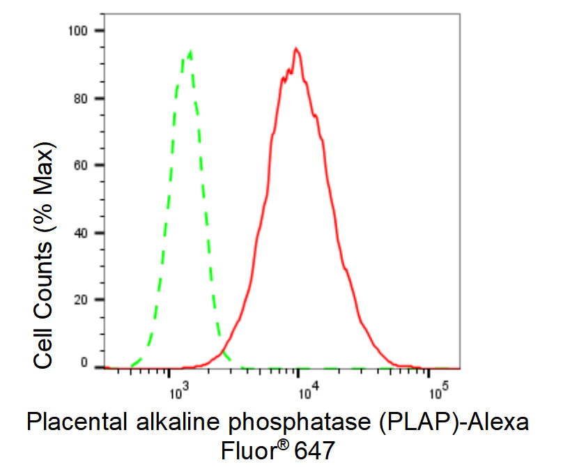 Flow cytometric analysis of Placental alkaline phosphatase (PLAP) expression in HepG2 cells using Placental alkaline phosphatase (PLAP) antibody. Green, isotype control; red, Placental alkaline phosphatase (PLAP).