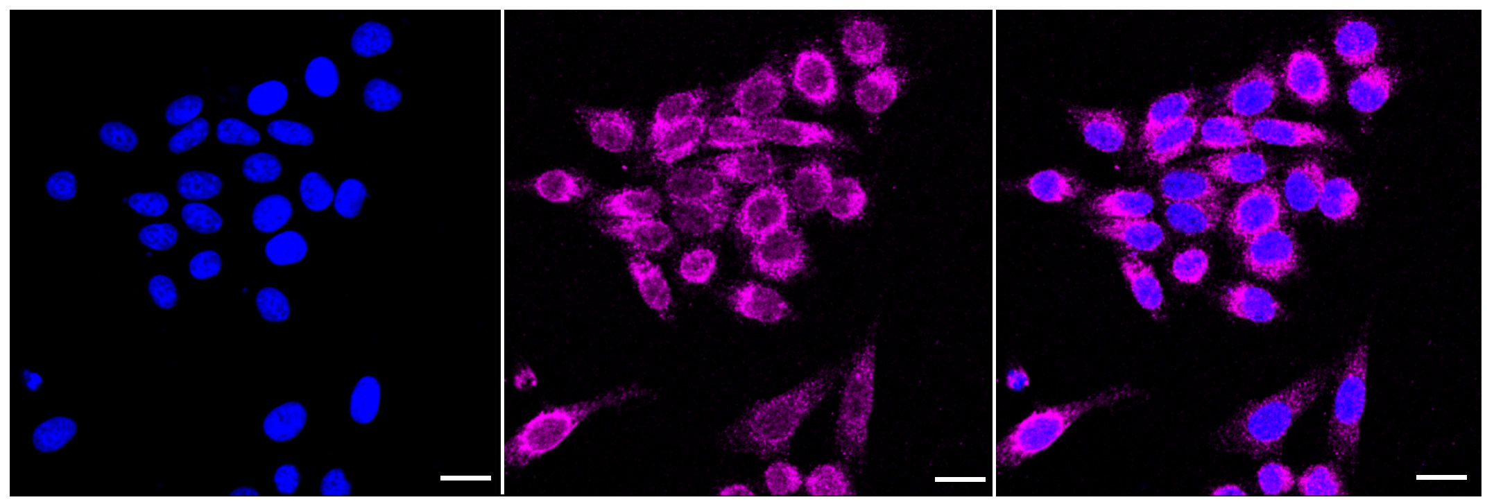 Immunocytochemical staining of HepG2 cells with Placental alkaline phosphatase (PLAP) antibody. Nuclei were stained blue with DAPI; Placental alkaline phosphatase (PLAP) was stained magenta with Alexa Fluor? 647. Images were taken using Leica stellaris 5. Protein abundance based on laser Intensity and smart gain: Medium. Scale bar: 20 μm.
