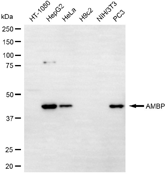 Western blotting analysis using AMBP antibody. Total cell lysates (30 μg) from various cell lines were loaded and separated by SDS-PAGE. The blot was incubated with AMBP antibody and HRP-conjugated goat anti-rabbit secondary antibody respectively.