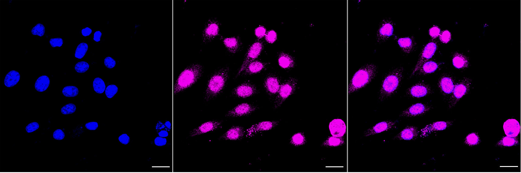 Immunocytochemical staining of HepG2 cells with ANP32B antibody. Nuclei were stained blue with DAPI; ANP32B was stained magenta with Alexa Fluor? 647. Images were taken using Leica stellaris 5. Protein abundance based on laser Intensity and smart gain: High. Scale bar, 20 μm.
