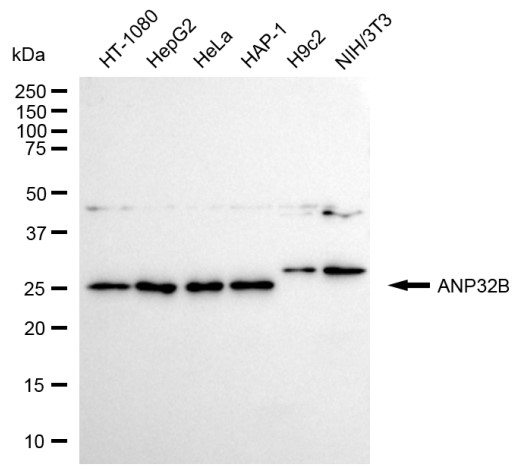 Western blotting analysis using ANP32B antibody. Total cell lysates (30 μg) from various cell lines were loaded and separated by SDS-PAGE. The blot was incubated with ANP32B antibody and HRP-conjugated goat anti-rabbit secondary antibody respectively.