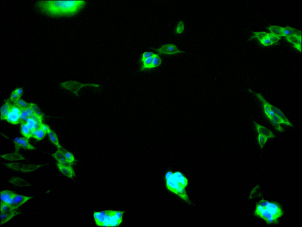 Immunofluorescence staining of SH-SY5Y cell with CSB-RA029446A0HU at 1:50, counter-stained with DAPI. The cells were fixed in 4% formaldehyde, permeabilized using 0.2% Triton X-100 and blocked in 10% normal Goat Serum. The cells were then incubated with the antibody overnight at 4°C. The secondary antibody was Alexa Fluor 488-congugated AffiniPure Goat Anti-Rabbit IgG(H+L).