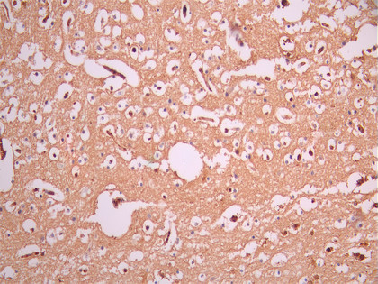 IHC image of CSB-RA981854A0HU diluted at 1:100 and staining in paraffin-embedded human brain tissue performed on a Leica BondTM system. After dewaxing and hydration, antigen retrieval was mediated by high pressure in a citrate buffer (pH 6.0). Section was blocked with 10% normal goat serum 30min at RT. Then primary antibody (1% BSA) was incubated at 4°C overnight. The primary is detected by a Goat anti-rabbit polymer IgG labeled by HRP and visualized using 0.05% DAB.