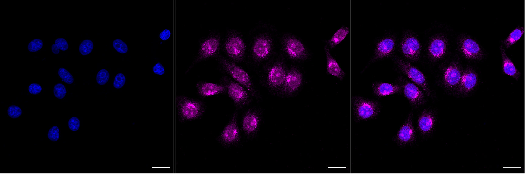 Immunocytochemical staining of HepG2 cells with Amyloid beta precursor like protein 2 antibody. Nuclei were stained blue with DAPI; Amyloid beta precursor like protein 2 was stained magenta with Alexa Fluor? 647. Images were taken using Leica stellaris 5. Protein abundance based on laser Intensity and smart gain: High. Scale bar, 20 μm.